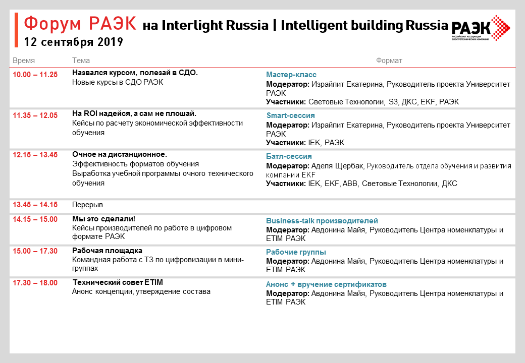 3-й год подряд Российская ассоциация электротехнических компаний участвует в деловой программе выставки Interlight Russia | Intelligent building Russia с Форумом, который собирает ведущих игроков рынка электротехники.