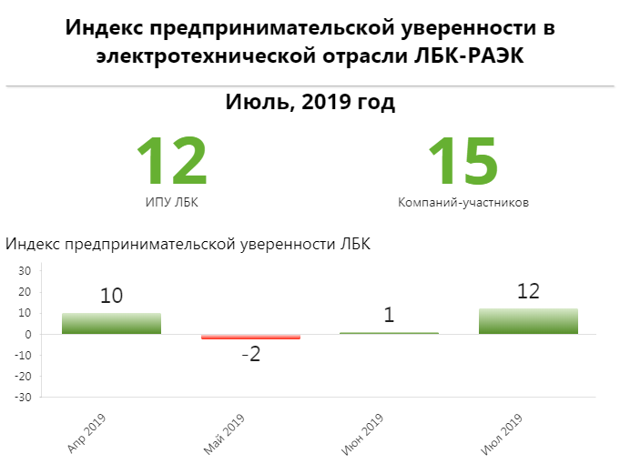 Индекс ЛБК-РАЭК в электротехнической отрасли в июле вырос на 11 пунктов к июню и достиг значения «+12» пунктов. Участники опроса, представители ведущих электротехнических компаний, положительно оценили итоги работы своих компаний во втором летнем месяце.
