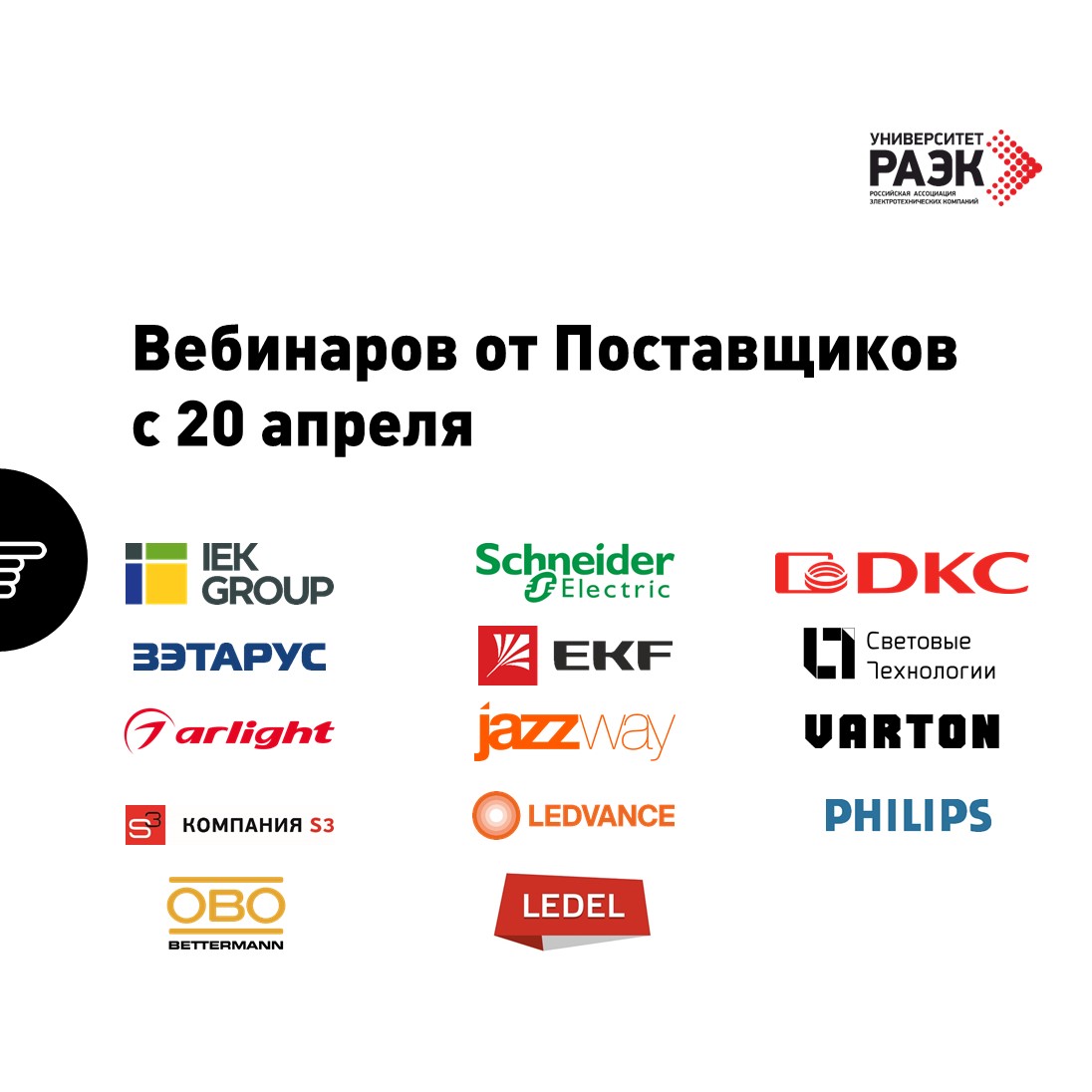20 апреля стартует новая серия из более 100 вебинаров с ведущими производителями электротехнической продукции: Arlight, EKF, IEK, Jazzway, Ledel, Ledvance, OBO Bettermann, S3, Schneider Electric, Varton, DKC, ЗЭТАРУС, Philips и Световые Технологии.